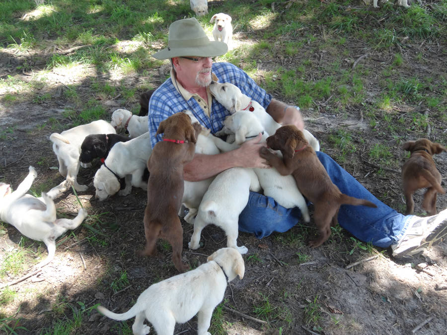 DOG BREEDING In 2007, a ministry friend of ours, Dennis Green of Old Dominion Labradors, donated a puppy to us to help us get a small breeding program started, in order to supplement our income for ministry work. Not wanting to wait until the puppy (Shelby of Covenant Farm) was old enough to breed, we purchased a breeding-age chocolate female Lab (Liberty of Covenant Farm), and used Denny's stud for our first litter of purebred Labs! Liberty passed away in October 2018 at 13 years old. Covenant Farm with its beautiful 112 acres, and at least a half hour away from everything, began to We love the breeding business. It is the very best business we have ever been involved with. We have been title examiners, group home parents, owned a printing company, an auto detailing business, and did fine woodworking to supplement income. Never have we had such a fulfilling work as raising healthy puppies of a unique breed for loving families. We continue to follow our puppies and their families throughout the lives of their pets, and sometimes beyond, having established a bond. We are still friends with folks that bought puppies from our very first litter.
